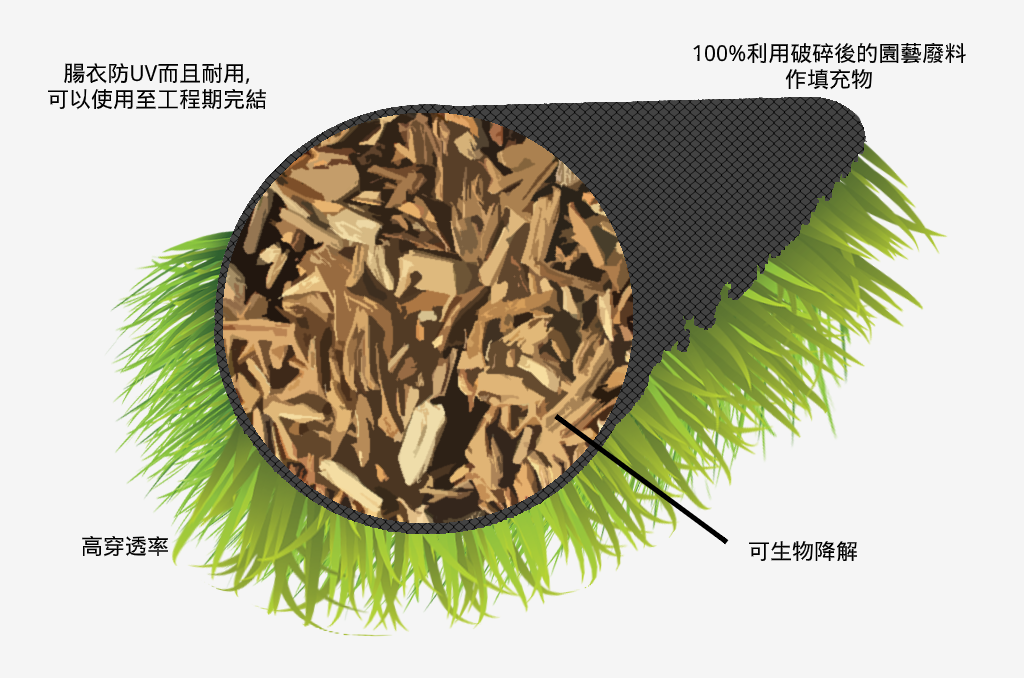 用腸狀的PP纖維網裝好木碎,完成後的˹木碎腸˼可用作過濾或減輕斜坡的侵蝕作用。˹木碎腸˼的應用範圍廣泛,因為用家能按需要把它裁成不同長度,方便運輸及應用。