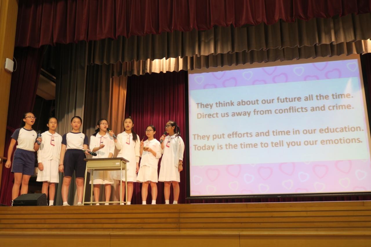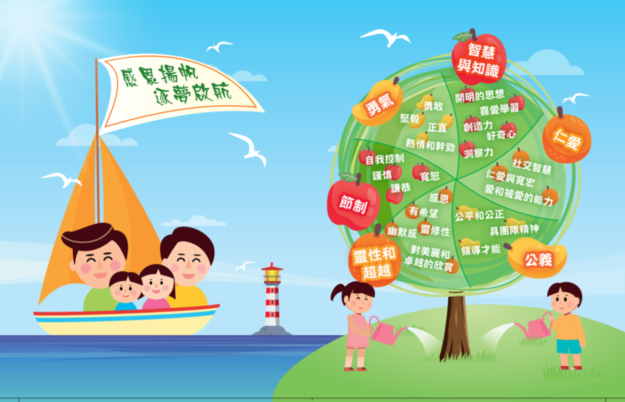 我們透過每天的早會及每星期一節的德育課,以不同的週訓主題及學習活動,亦會與不同科組合作,配合主題進行跨科組協作活動,協助學生建立積極的人生觀,使她們能常懷感恩、欣賞自己,並成為主愛人及愛祖國的良好公民。