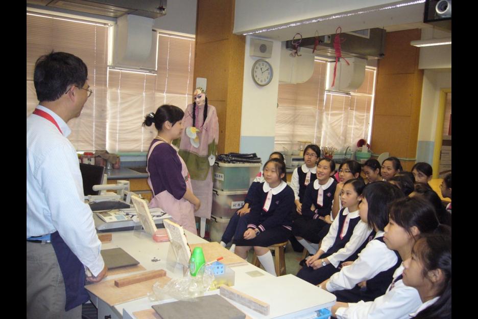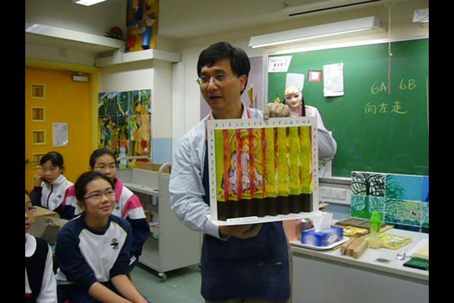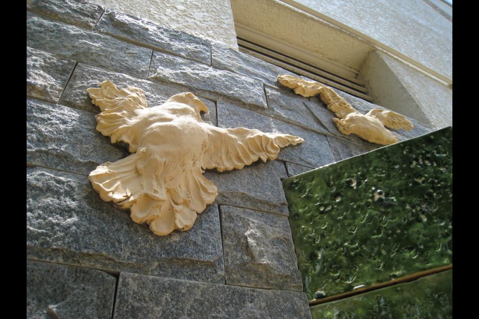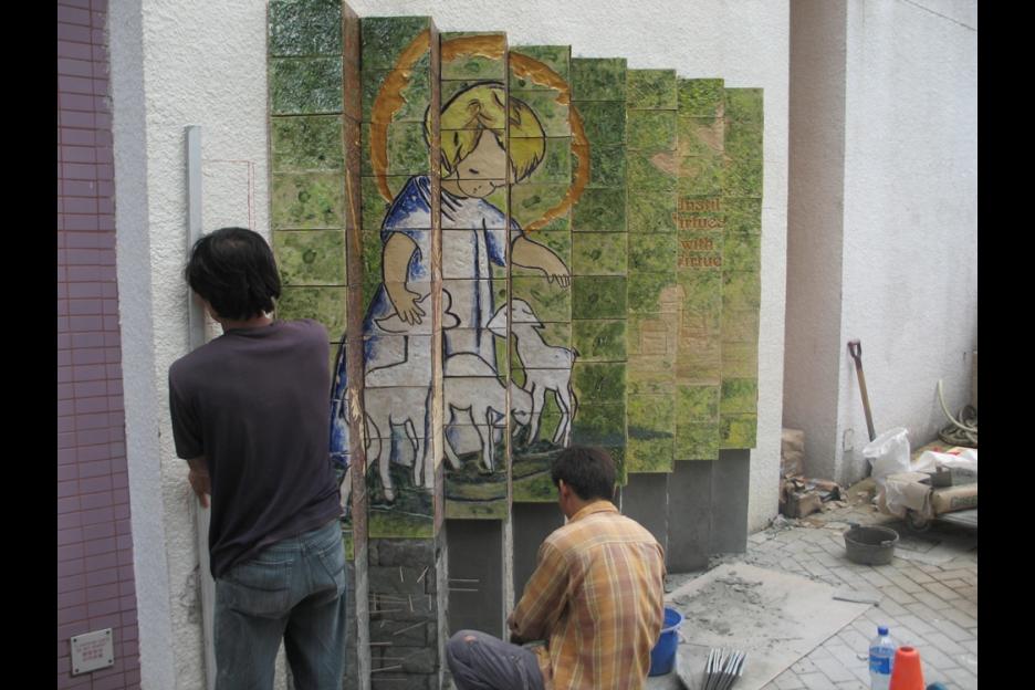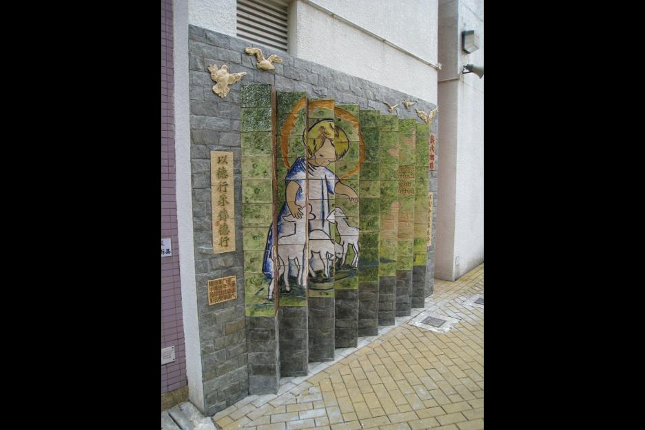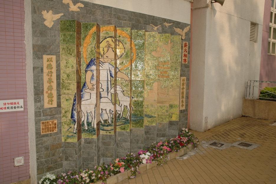 面向放學的方向,主題為耶穌牧養羊群,寓意學生在學校接受教育,將所學貢獻社會,所以這面壁飾特命名為「以德行承傳德行」。