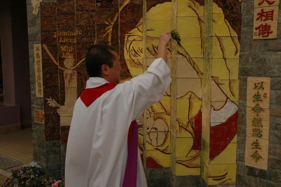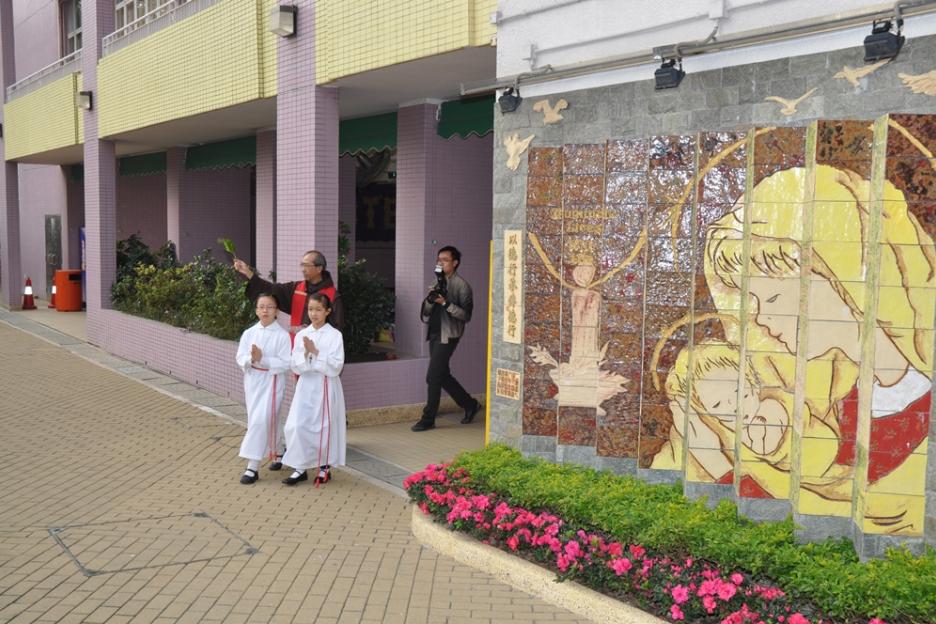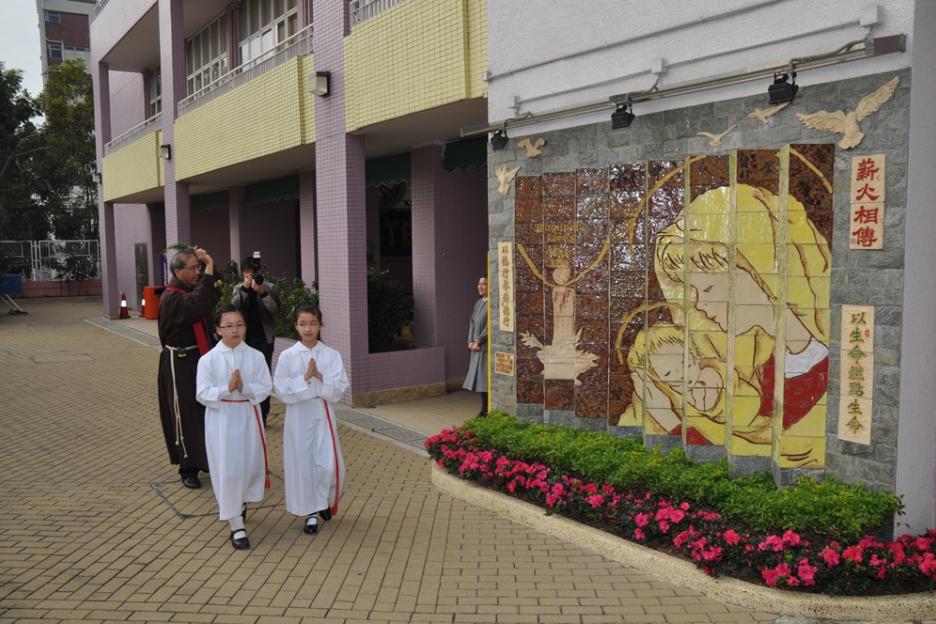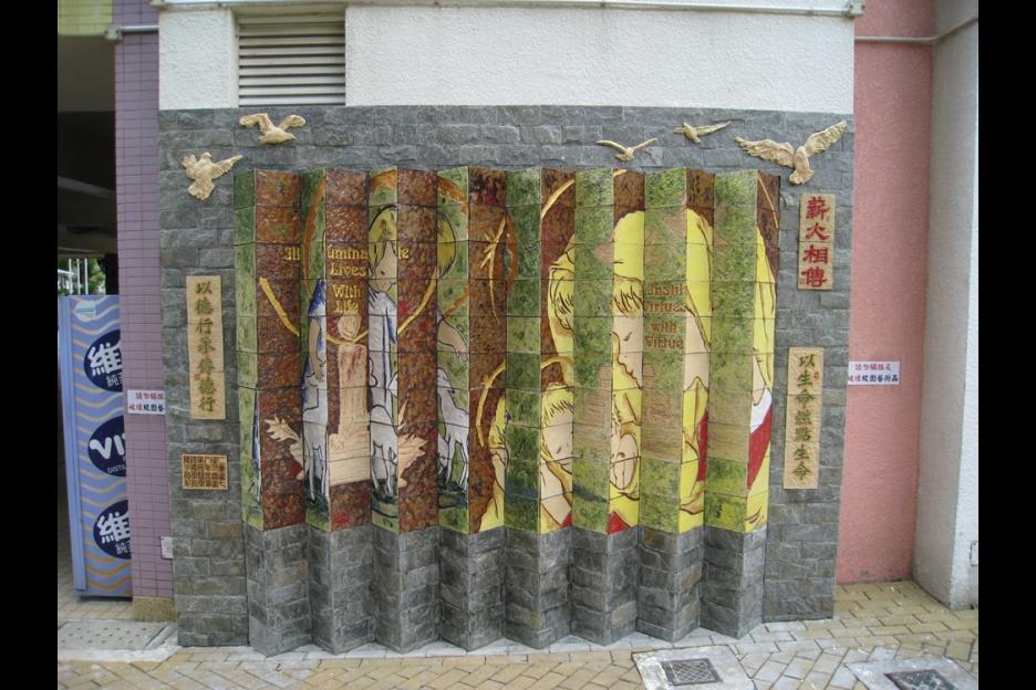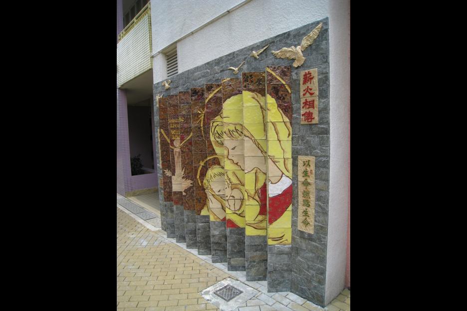 面向上學的方向,主題為聖母照顧小耶穌,寓意父母將子女交託到學校讓他們接受教育,老師也必如聖母般好好栽培耶穌,所以這面壁飾特命名為「以生命燃點生命」。