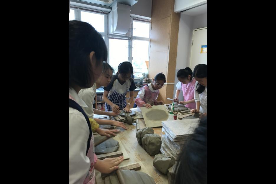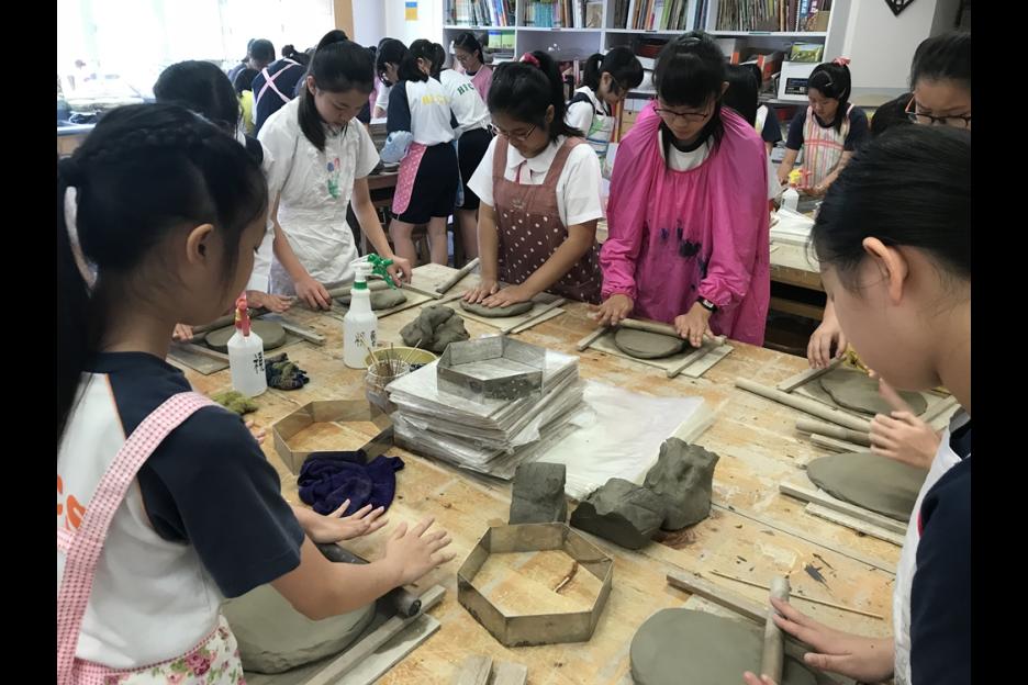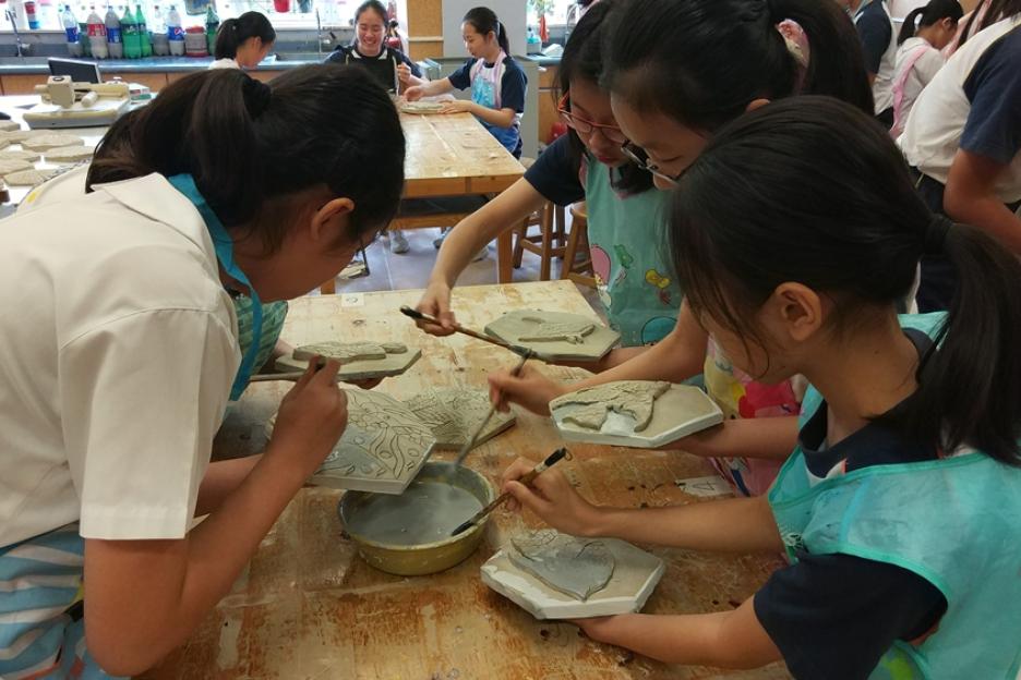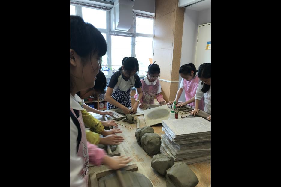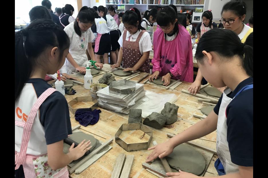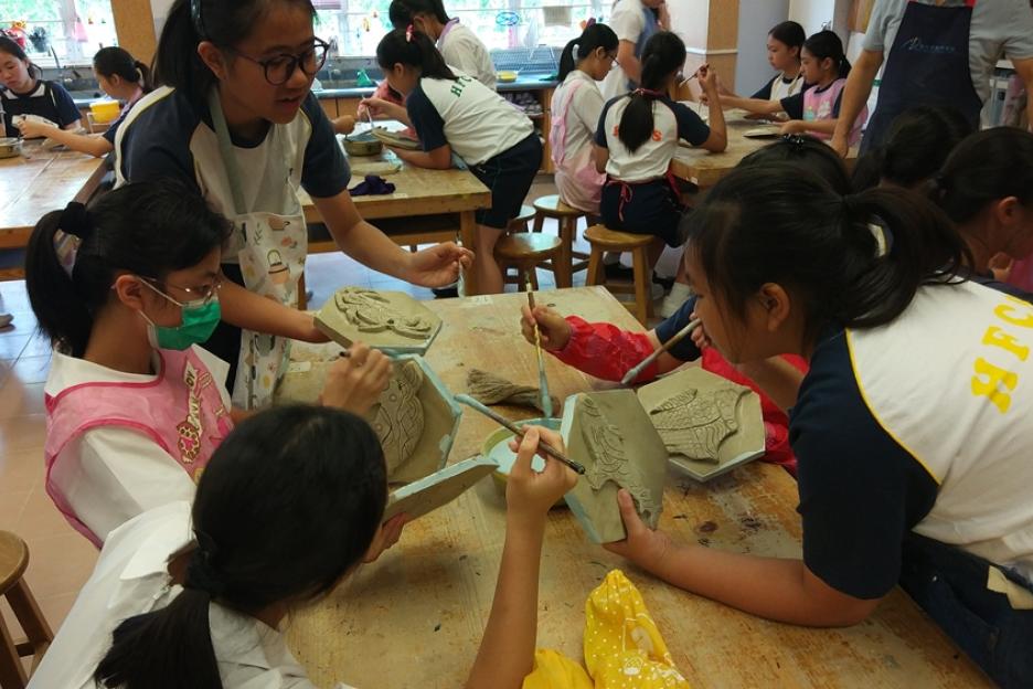 本陶磚壁飾座落於本校一號梯五樓,主題為創世紀的第五天。「天主造了大魚和水中各種生物以及和種飛鳥。」(取自創1:27),作品的主題為水中的生物和天上的飛鳥。壁飾中,學生分別以雕和塑的技法呈現各種生物的剪影。釉色上,再配以不同調值的藍與綠,營造水天一色的感覺,顯得份外和諧。 |