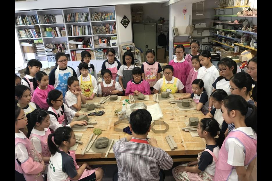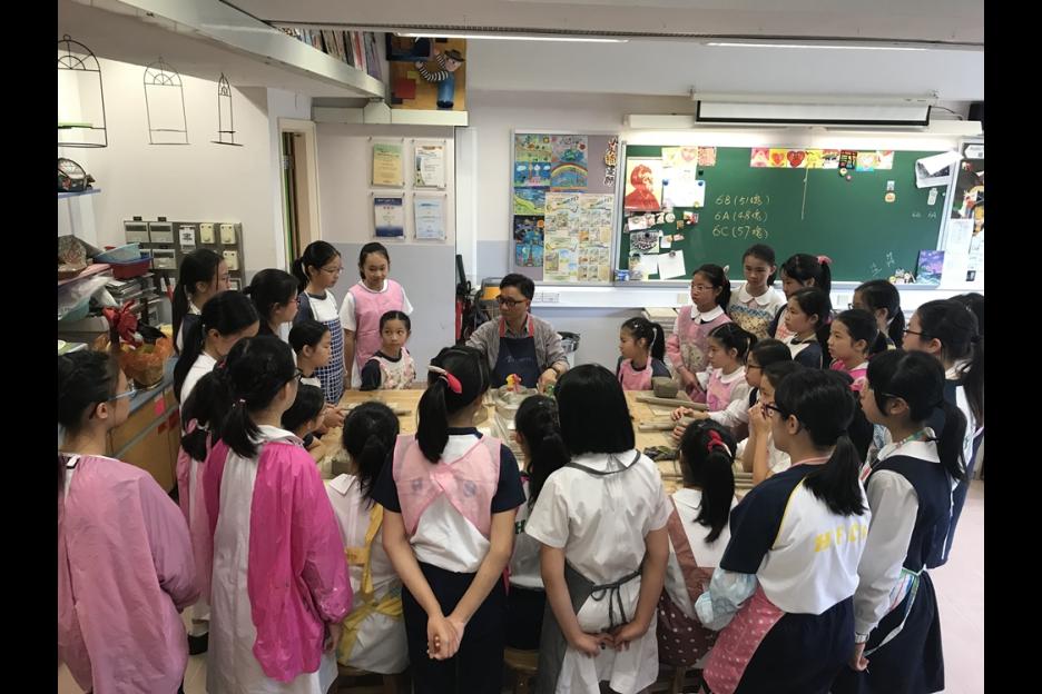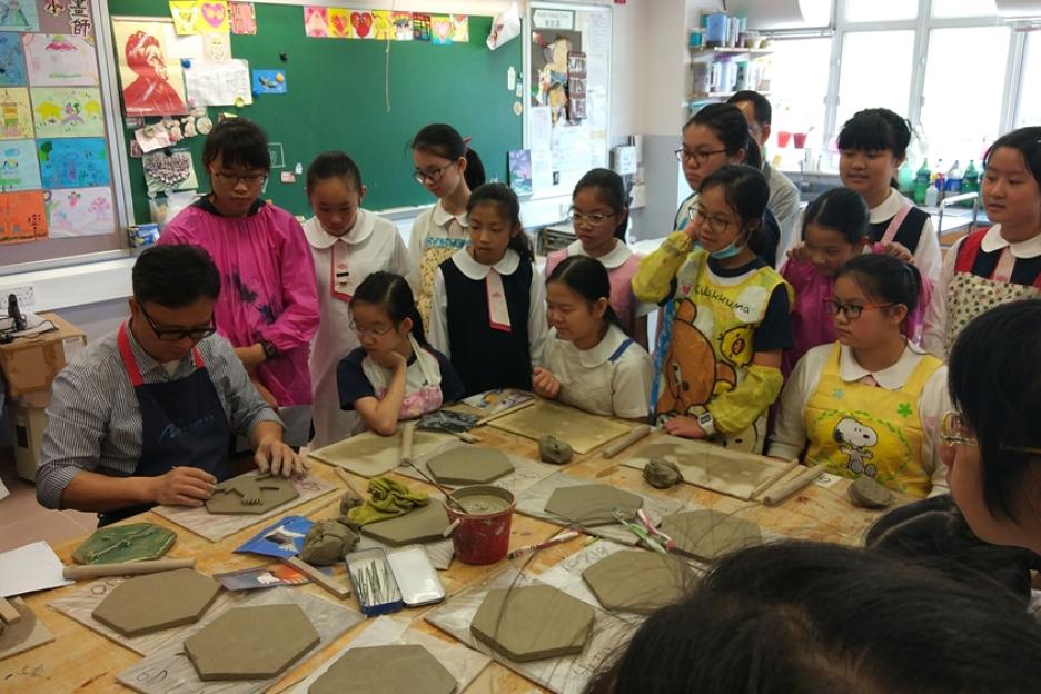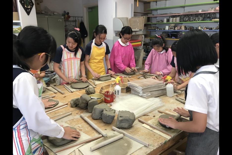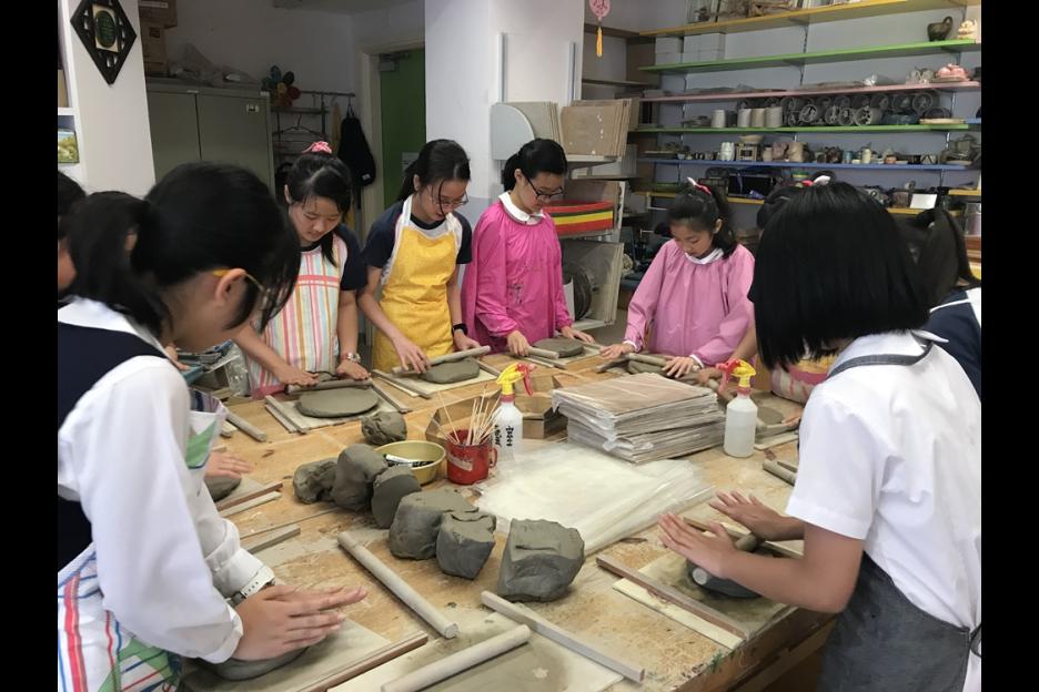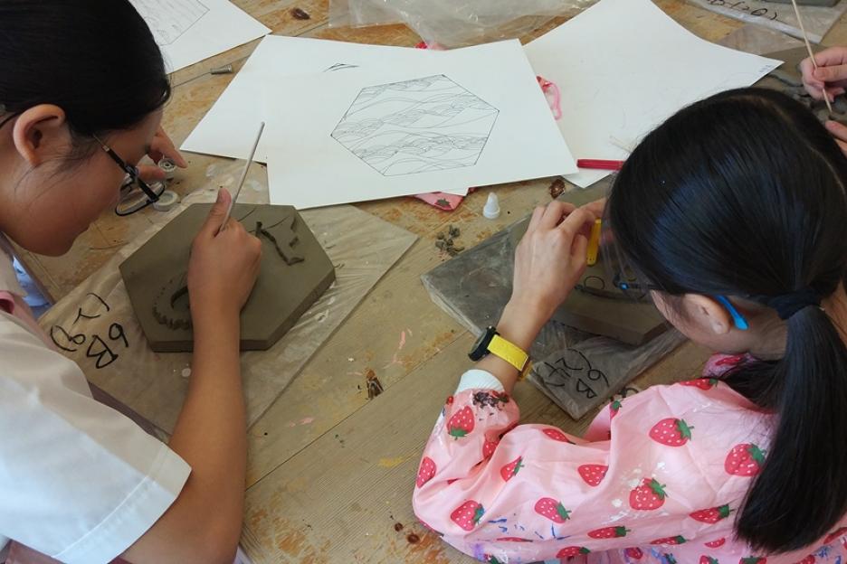 本陶磚壁飾座落於本校一號梯五樓,主題為創世紀的第五天。「天主造了大魚和水中各種生物以及和種飛鳥。」(取自創1:27),作品的主題為水中的生物和天上的飛鳥。壁飾中,學生分別以雕和塑的技法呈現各種生物的剪影。釉色上,再配以不同調值的藍與綠,營造水天一色的感覺,顯得份外和諧。 |