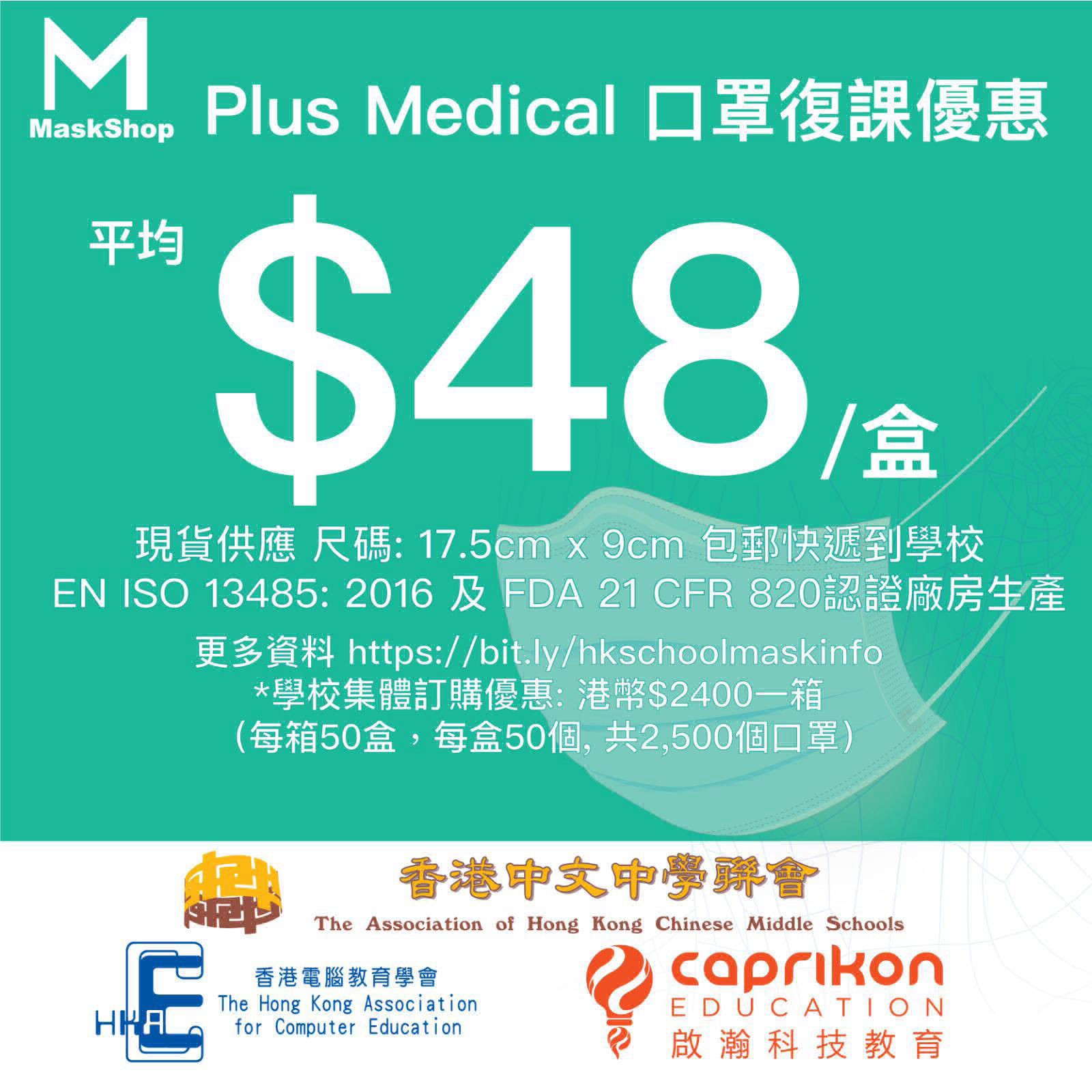 • 學校集體訂購優惠:港幣 $2,400 一箱 (每箱 50 盒,每盒 50 個,共 2,500 個口罩)