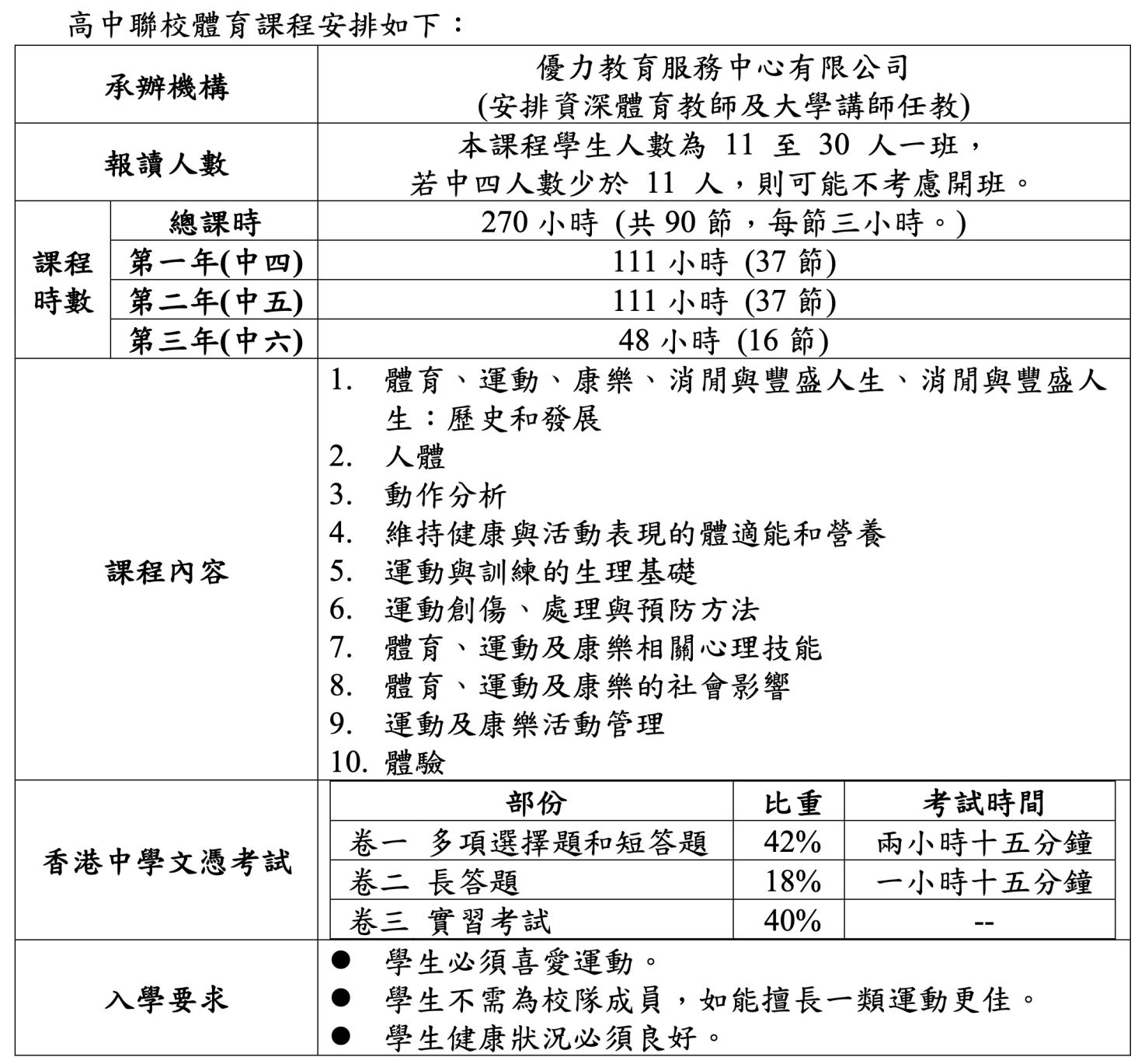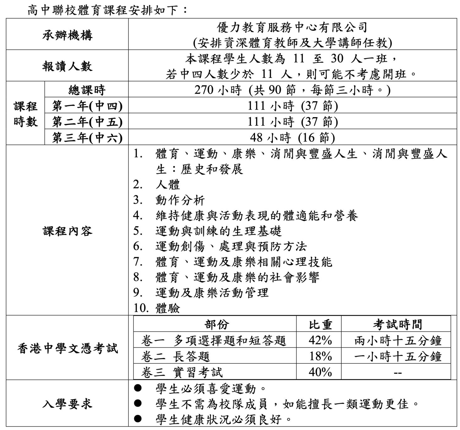 教育局自推出優化高中四個核心科目的安排,不少會員學校也積極考慮提供更多香港中學文憑考試的科目讓學生選擇。故此香港中文中學聯會特籌辦高中聯校體育課程,鼓勵會員學校的高中學生追求卓越,作多元化學習,擴闊視野,面向世界,開拓更廣闊之升學及就業機會。
