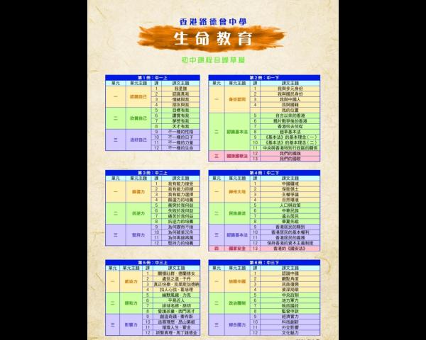 自2019年起,本校德育、公民及國民教育組以校本「生命教育節」為契機,逐步建立有系統的價值教育。我校辦學團體    ─    香港路德會,為進一步發展屬下學校的價值教育工作,編訂了六冊《生命教育》課本。課本內容涵蓋了品德培育與國民教育等元素,我們藉著書中許多人物傳記,以深入淺出的方式,向學生介紹古今中外偉人的事跡與他們展現的品德涵養,潛移默化地建構學生正面價值觀,為他們樹立學習榜樣。