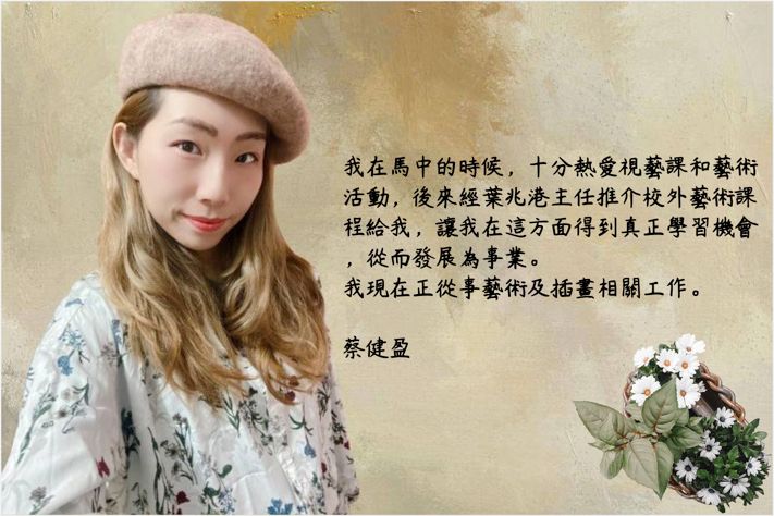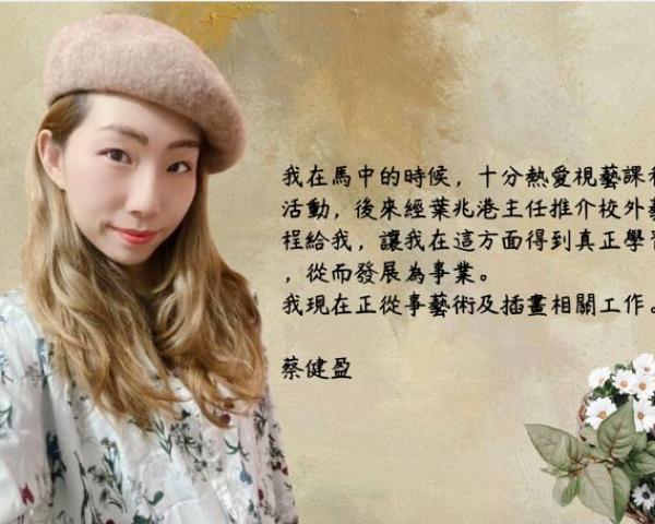 我在馬中的時候,只喜歡視藝課和一些藝術活動,葉兆港主任推介校外藝術課程給我,讓我在這方面得到真正學習機會,從而發展為事業。我現在正從事藝術及插畫相關工作。