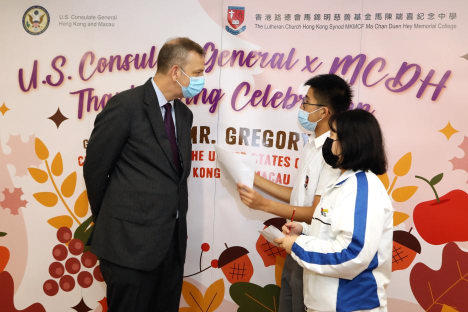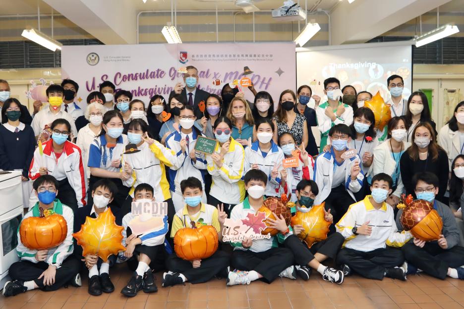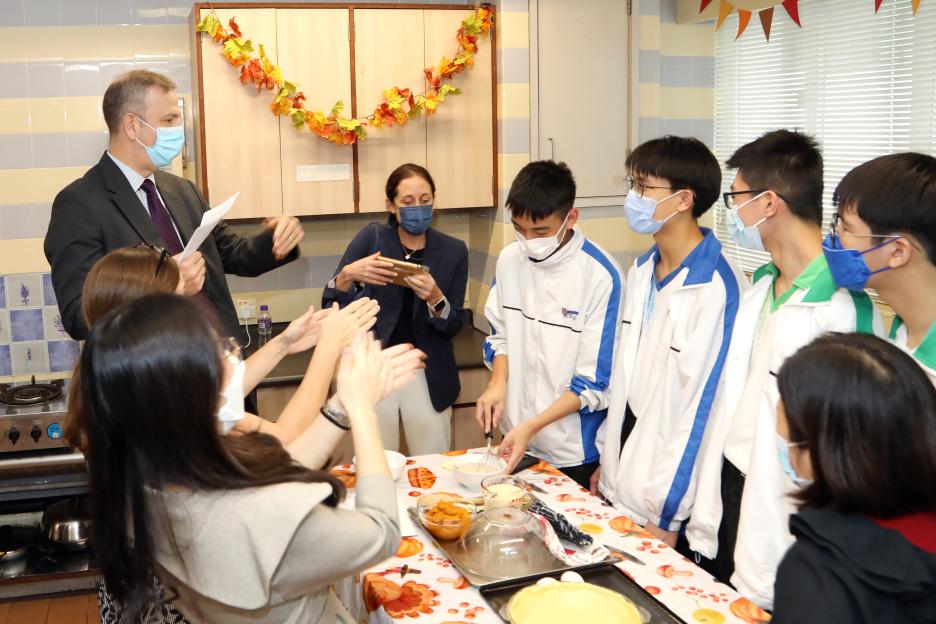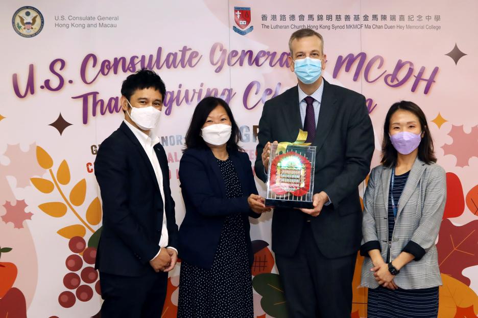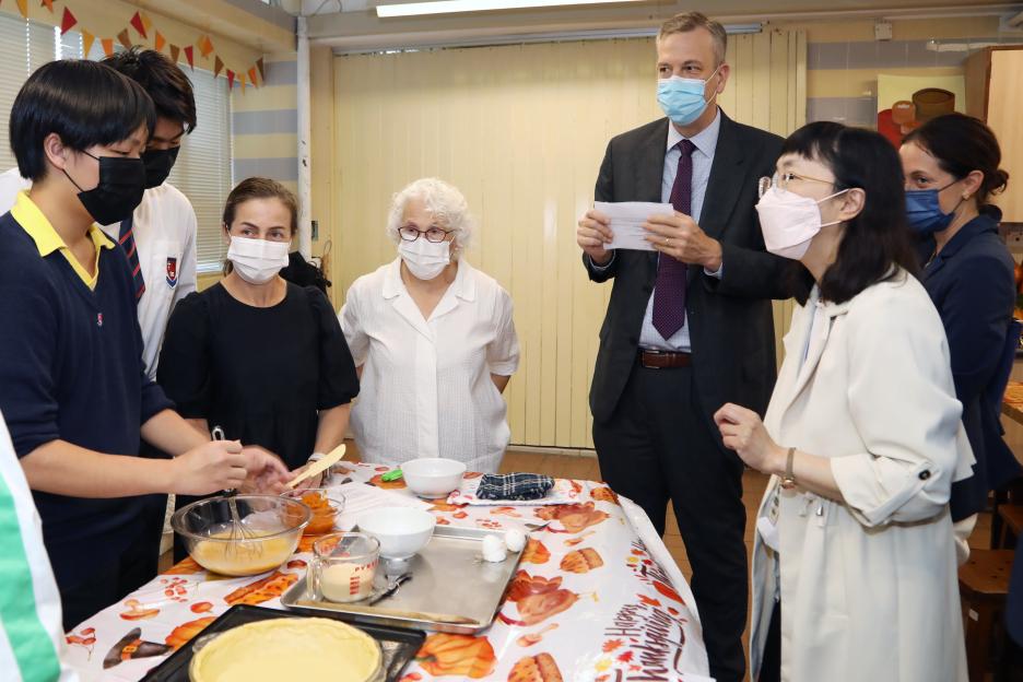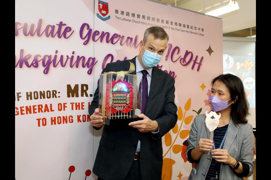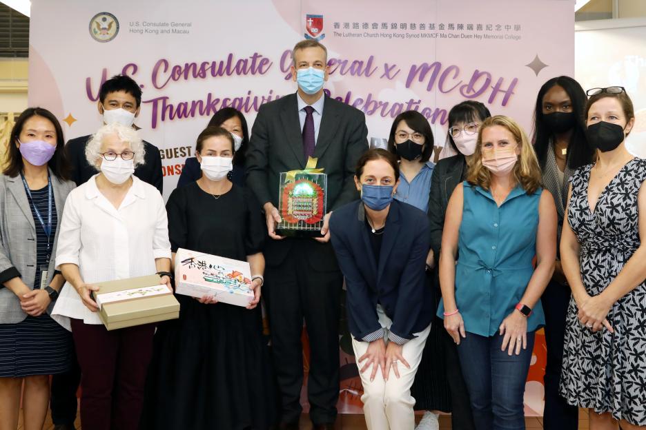 美國駐港澳總領事梅儒瑞先生(Mr. Gregory May)及夫人於2022年11月23日率先帶領十名居港美國義工到本校一同慶祝。