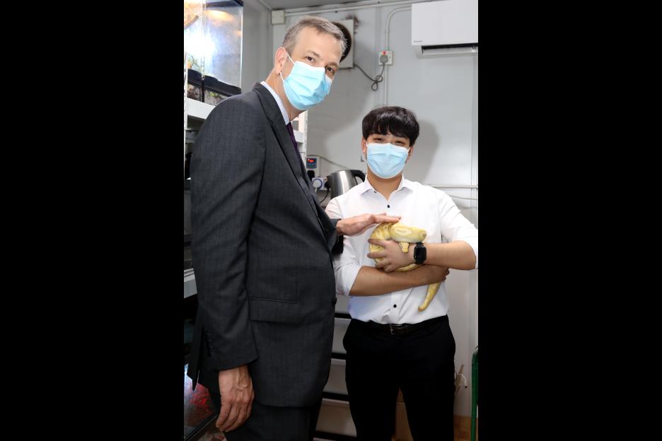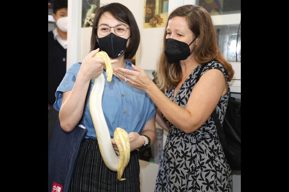 十名美國義工先在午膳時間參加Music Cafe活動,與同學一起唱歌,之後義工團隊參觀馬中爬蟲館,和爬蟲合照!