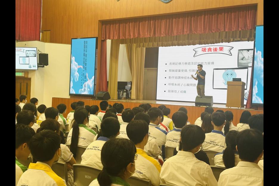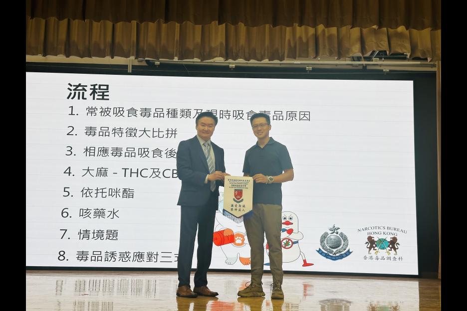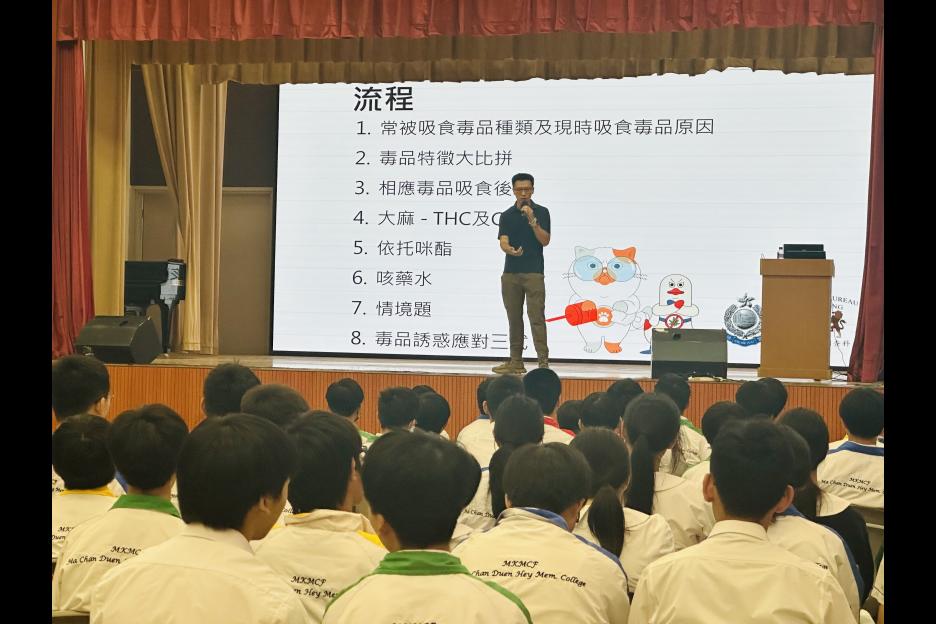 將軍澳警區的學校聯絡主任馮警長今日到校進行禁毒訓育講座,講座主要介紹毒品種類及青少年吸食毒品原因、副作用及最高刑罰等。當中輔以真實個案講解,提升同學防毒意識,最後更向同學傳授毒品誘惑應對三式,堅決向毒品說「不」!