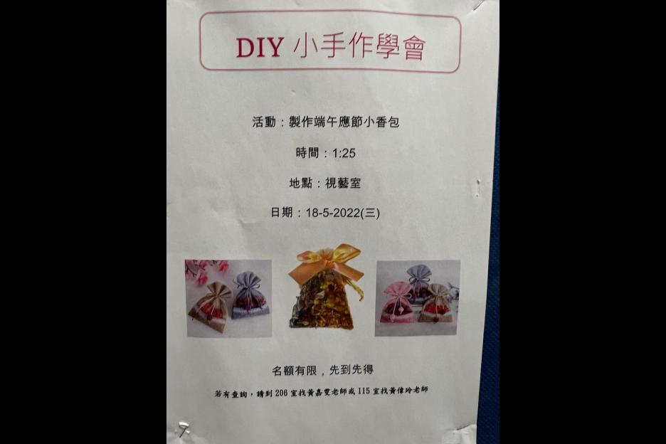 端午節除了划龍舟和包糉子,應節習俗還不少得佩戴香包呢!端午節前夕,視覺藝術學會聯同DIY小手工學會舉行了「糉有你」活動,同學親手製作獨一無二的小香包和摺紙糉子,從中加深同學對端午節這個傳統節日的了解。
