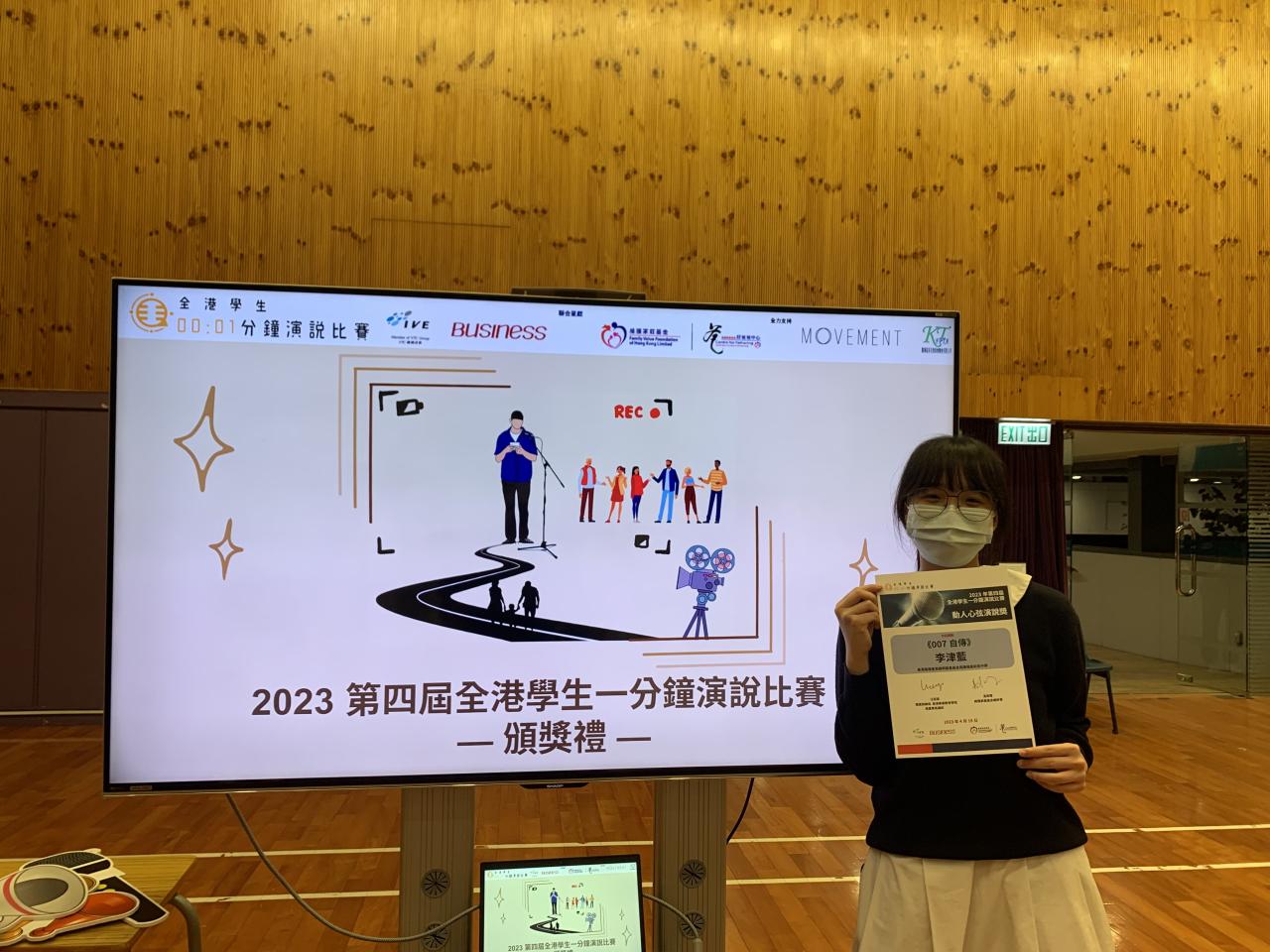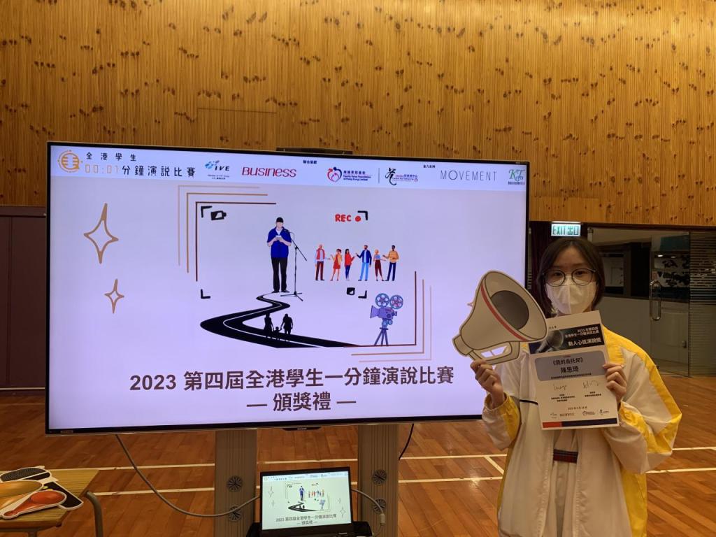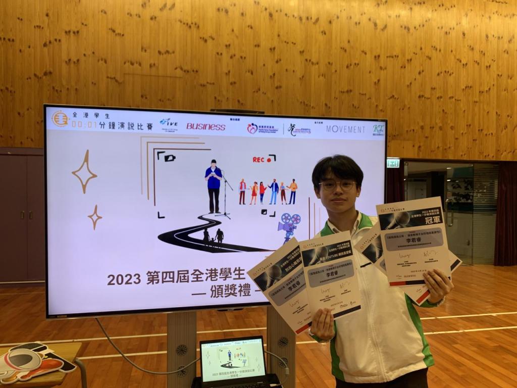本校三名中文演講及辯論隊隊員早前於「第四屆全港學生一分鐘演說比賽2023」囊括六個獎項,其中李君睿同學更於芸芸參賽者中突圍而出,勇奪總冠軍,表現卓越斐然。同時,李同學的作品於不同社交媒體上廣受歡迎,因而獲得網民喜愛獎。