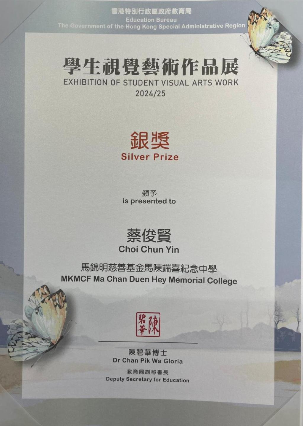 5C蔡俊賢參加中學生視覺藝術作品展2024/25榮獲銀獎,並獲得《視覺藝術資優教育計劃:北京視覺藝術研習團》面試機會,有機會到北京中央美術學院交流,參加《精微素描》證書課程。