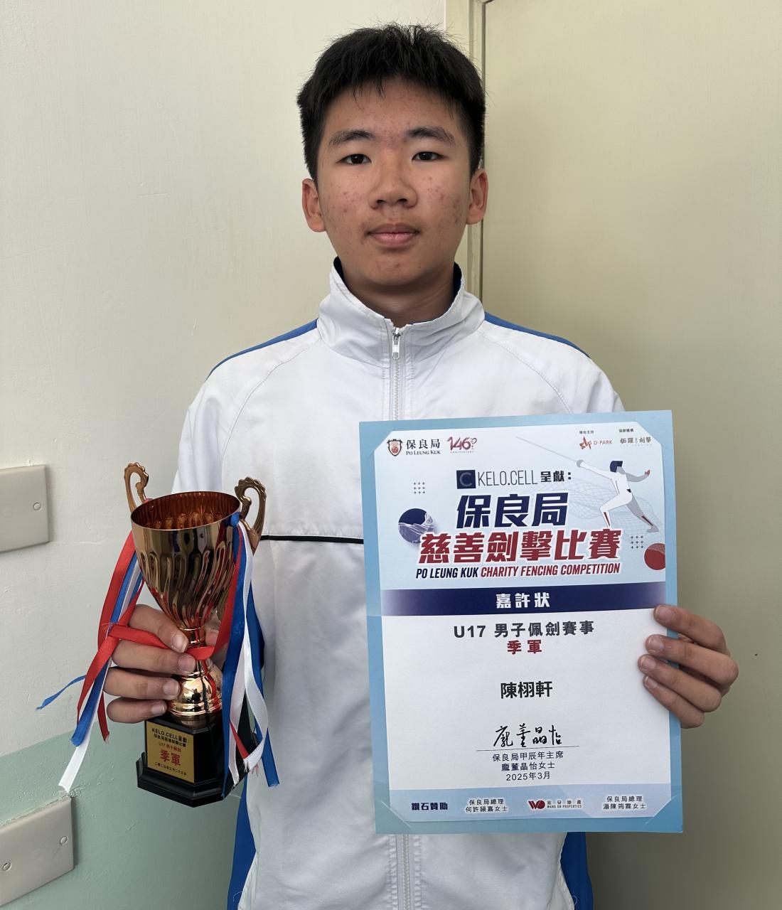 在保良局慈善劍擊比賽中,4C 陳栩軒於男子U17佩劍組別中表現出色,最終榮獲季軍。比賽中,他展現了高超的劍術技巧。在每一輪的對抗中,陳栩軒都能迅速分析對手的動作,靈活運用戰術,成功地擊敗多位強勁的對手。這次比賽不僅是對他個人劍擊技術的挑戰,更讓堅定了在劍擊運動上持續努力的決心,並激勵他在未來的比賽中追求更高的成就。