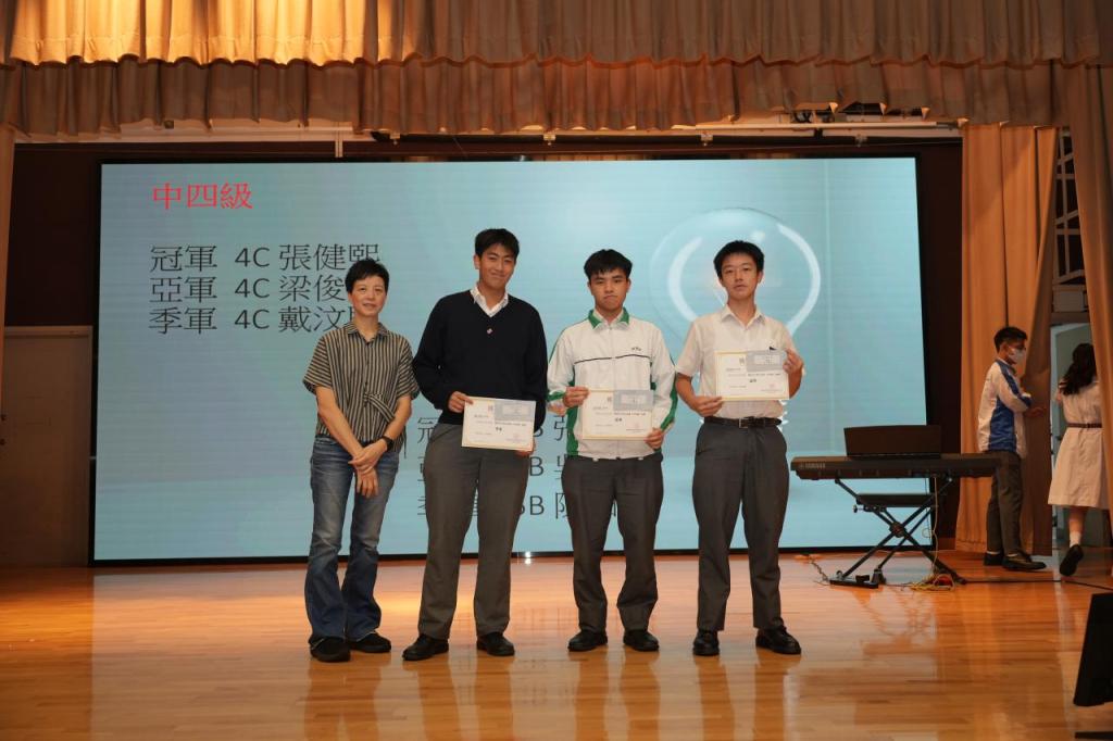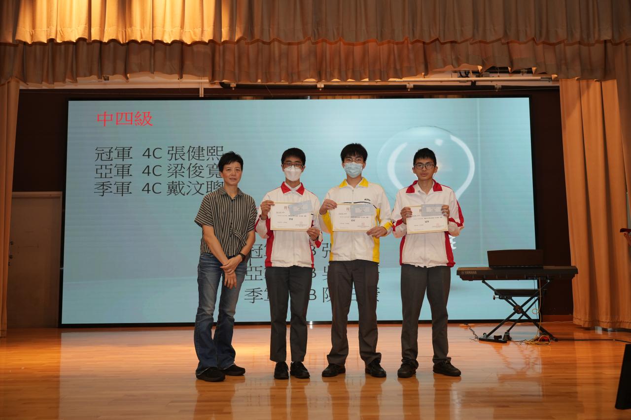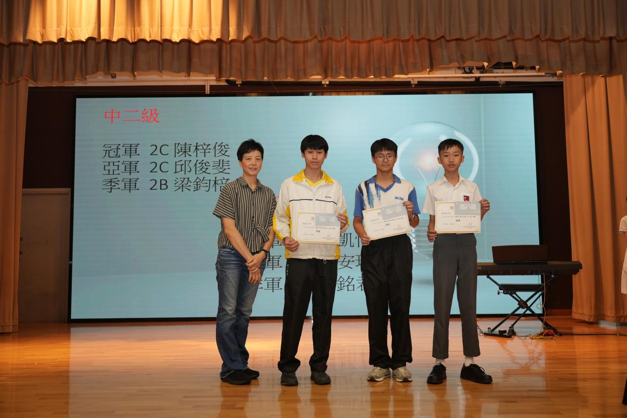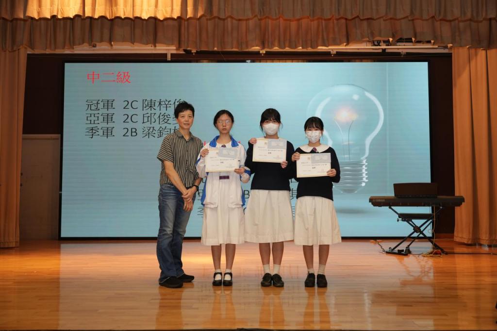 (中一)冠軍 1A 麥梓晴亞軍 1A 張紫靖季軍 1B 丘凱悠(中二)冠軍 2C 陳梓俊亞軍 2C 邱俊斐季軍 2B 梁鈞棓(中三)冠軍 3B 蘇凱怡亞軍 3B 賴安琪季軍 3C 張銘君(中四)冠軍 4C 張健熙亞軍 4C 梁俊寬季軍 4C 戴汶聰(中五)冠軍 5B 張雋晞亞軍 5B 吳柏熹季軍 5B 陳日康