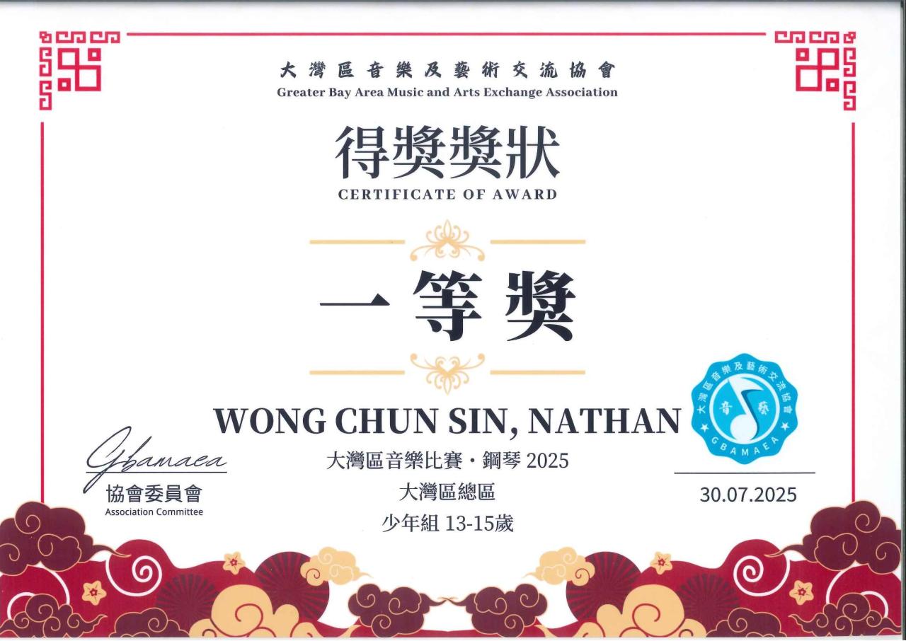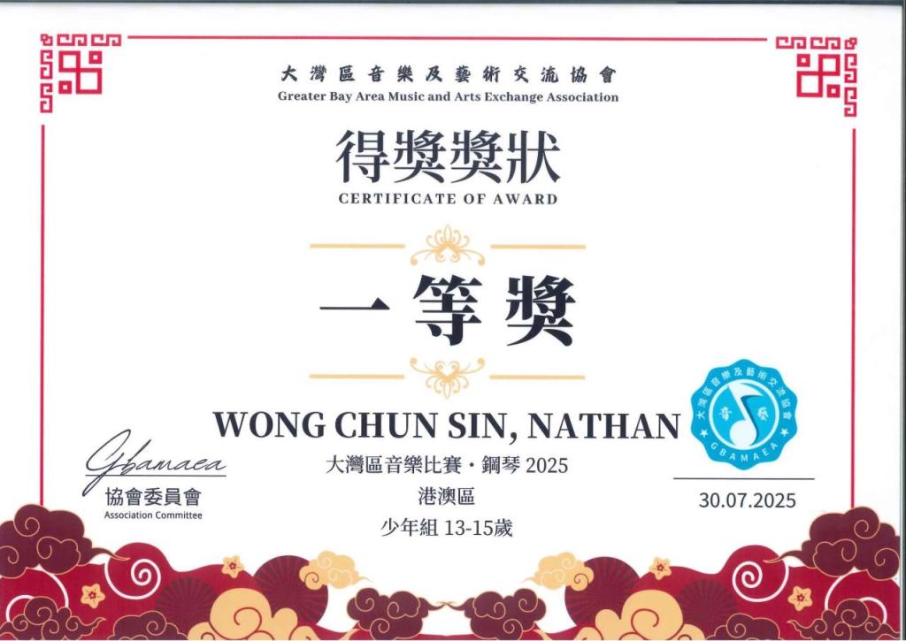 2B 黃俊善於大灣區音樂比賽 鋼琴組2025 少年組 13-15歲 於港澳區及大灣區總區 獲得一等獎。