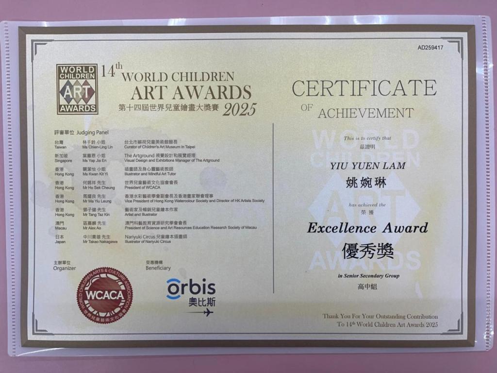 本校高中視覺藝術科學生參加 第十四屆世界兒童繪畫大賽,4C 姚婉琳 榮獲優秀獎。
