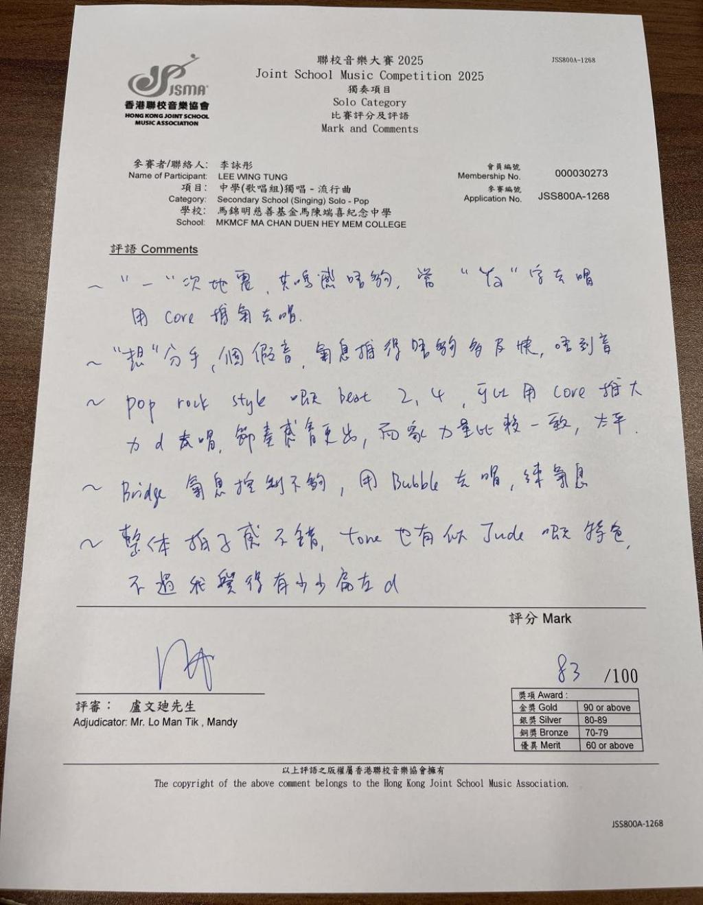 在3月31日,5A李詠彤同學參加「聯校音樂大賽2025:中學(歌唱組)獨唱 - 流行曲」奪得銀獎。