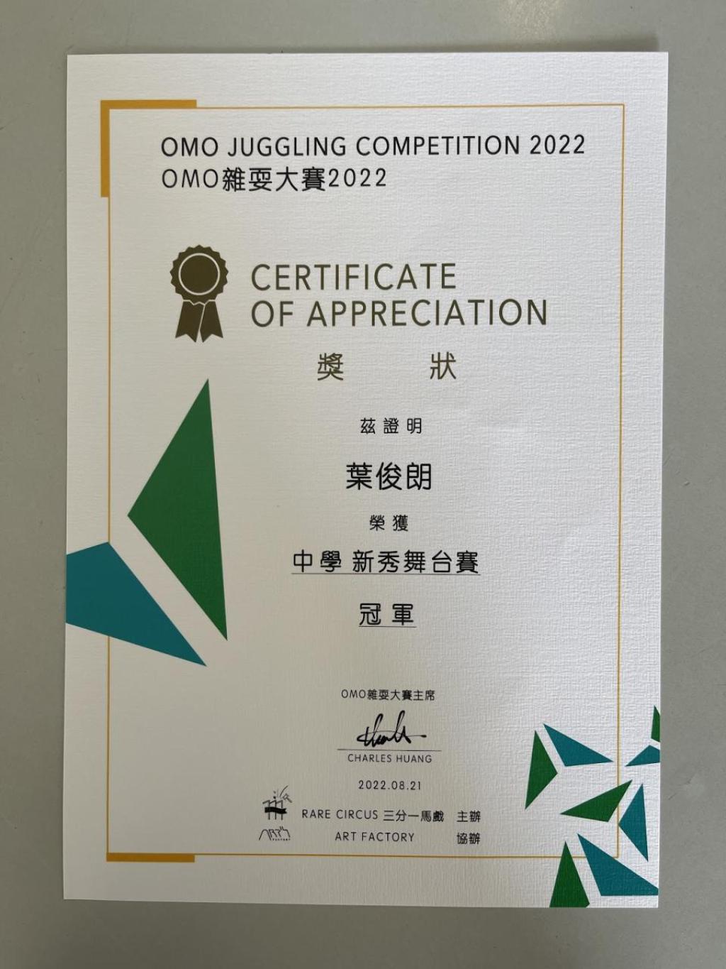 本校4B葉俊朗同學於「OMO雜耍大賽2022」中勇奪「中學新秀舞台組 冠軍」,是次賽事由Rare Circus三分一馬戲主辦,HKAC Art Factory協辦,假香港藝術中心進行賽事,並設有初賽及決賽,最後葉同學勇奪上述獎項