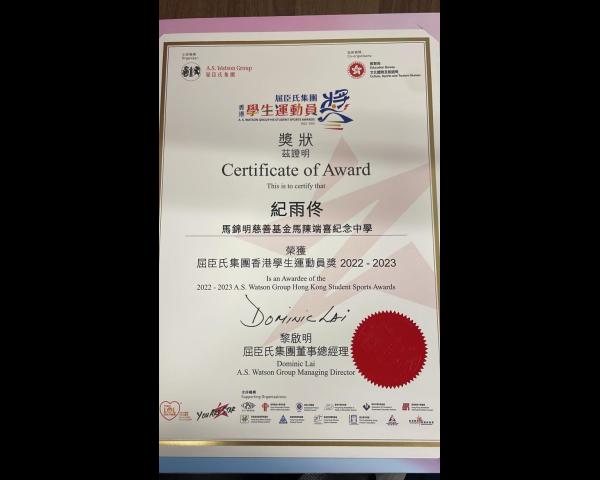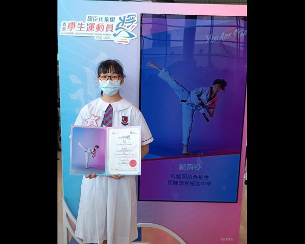 紀雨佟同學榮獲「屈臣氏集團香港學生運動員獎」